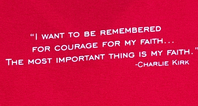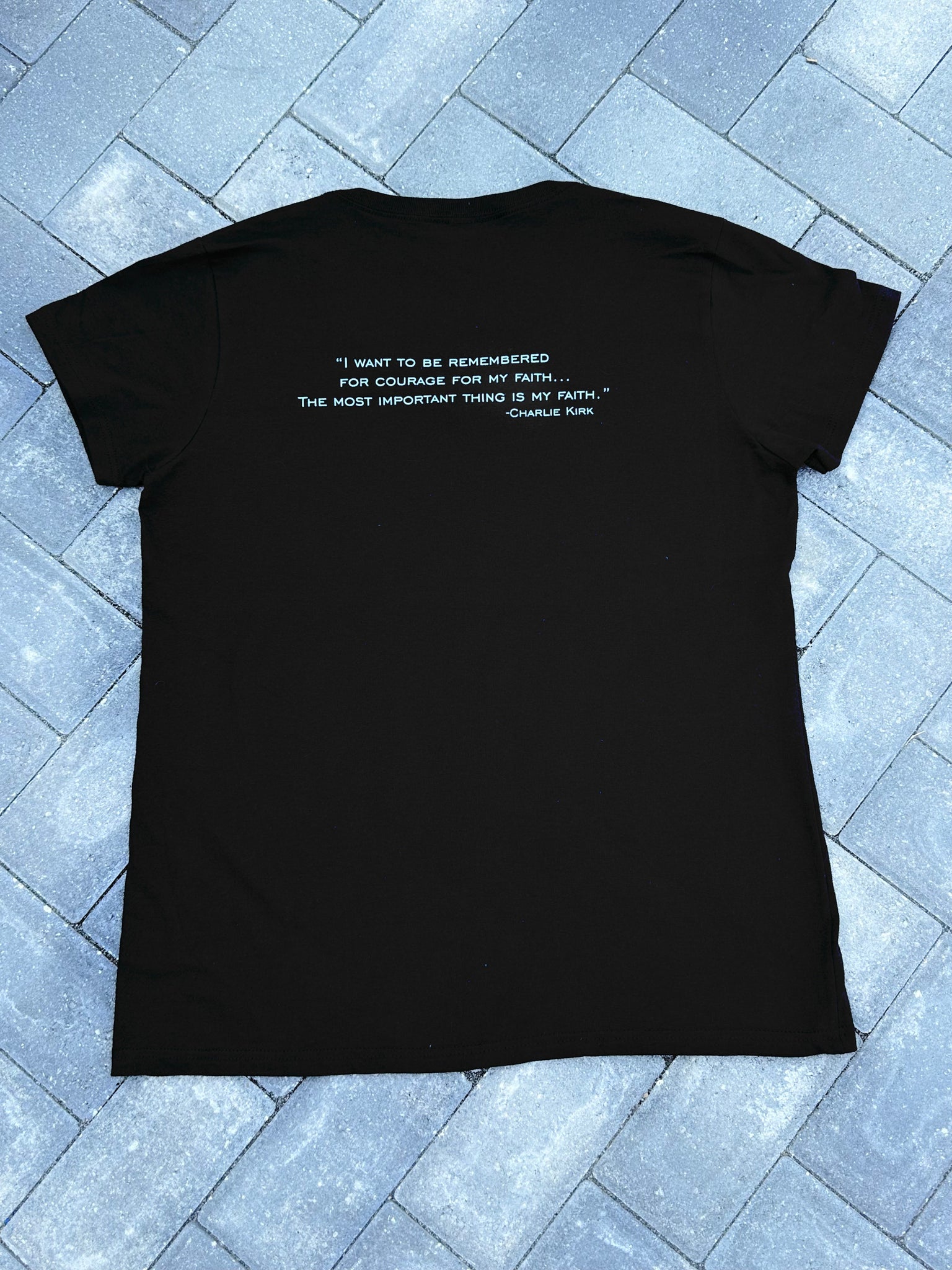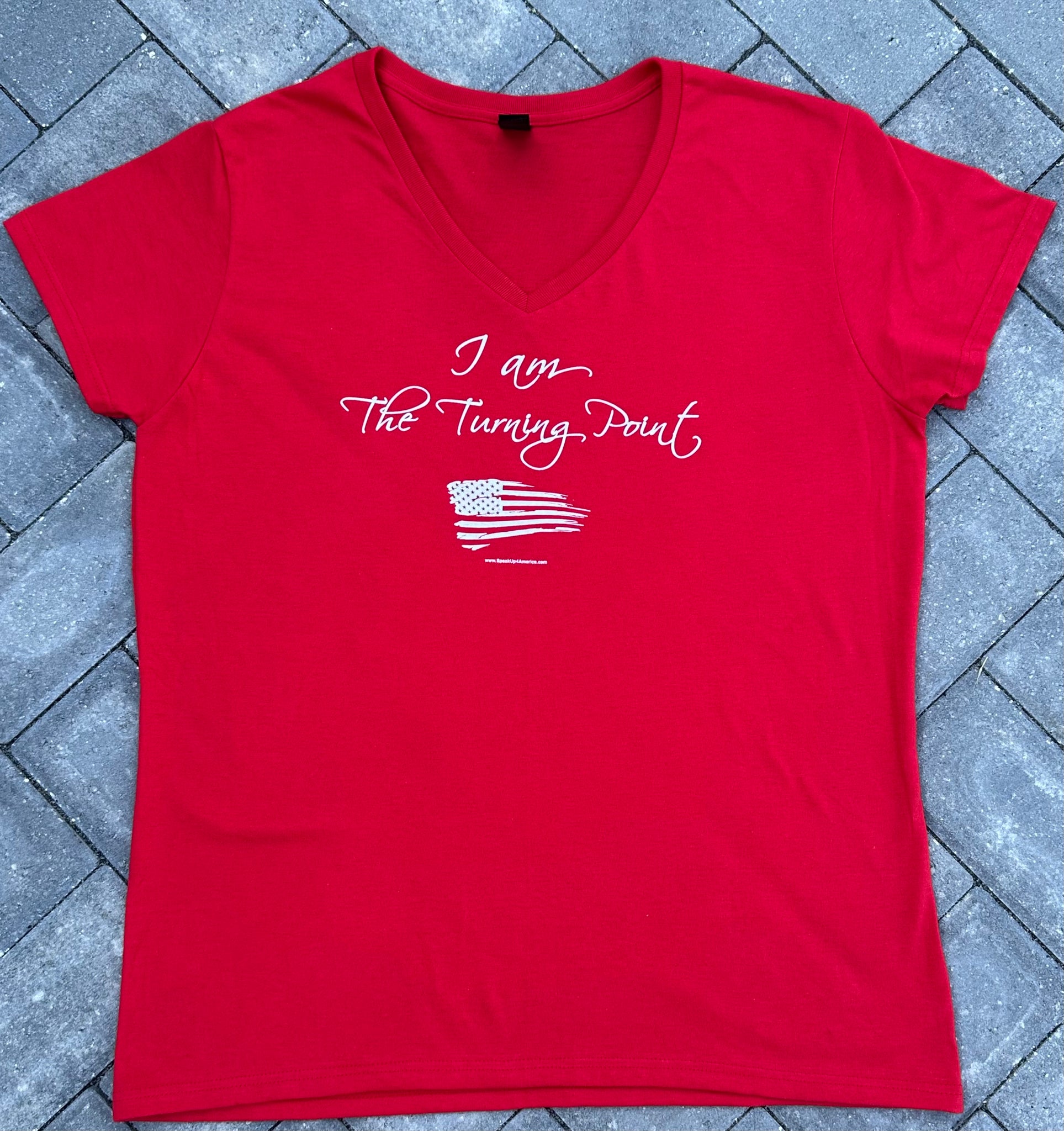 “I Am The Turning Point -Ladies V- neck T-Shirt- 2-Sided- BACK States Charlie Kirk’s Words.Choice Of Back Or Red. PLEASE CLICK On Photo For Better Visibility. For purchase at TrumpGirl.com